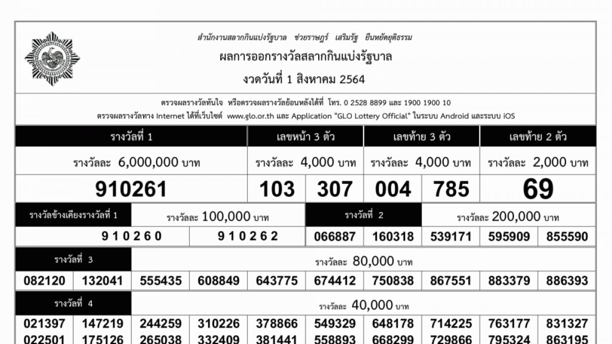 Source: news140daily.com Jun 01, 2021 · งวดวันที่ 1 สิงหาคม 2564 รางวัลที่ 1 รางวัลละ 6,000,000 บาท เลขหน้า 3 ตัว